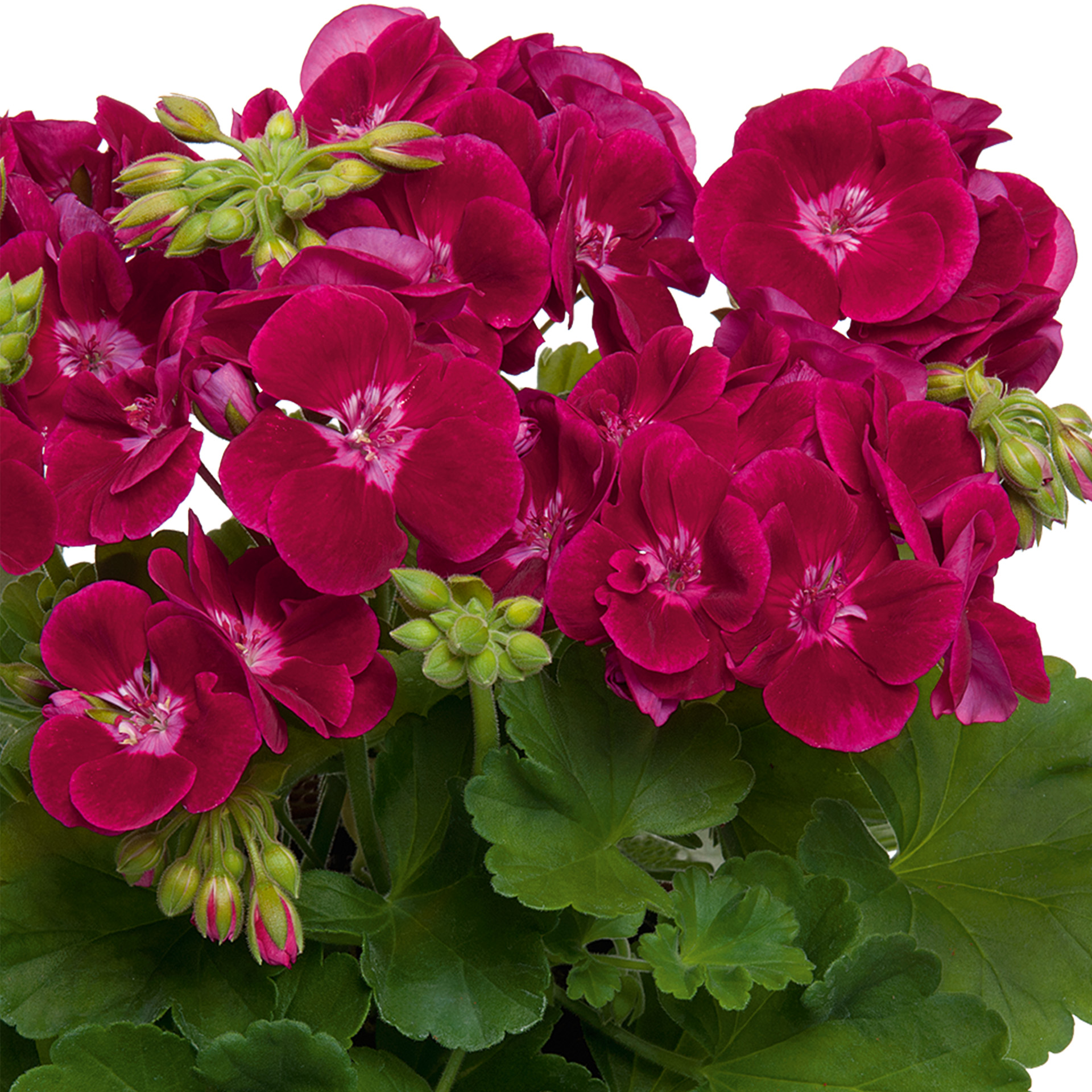 Die Geranie gehört zu den beliebtesten Balkonpflanzen, weil sie ein sehr robuster Dauerblüher ist. In unserer Gärtnerei kultivieren wir über 30 verschiedene Sorten von stehenden und hängenden Geranien. Die Sorte 'Flower Fairy Velvet' wächst kompakt mit frischgrünem Laub und hat halbgefüllte samtrote Blüten mit rosa Rand und Auge. Von Mai bis Oktober wachsen immer neue Blüten nach. Sie erreicht eine Wuchshöhe von 30-50cm.
