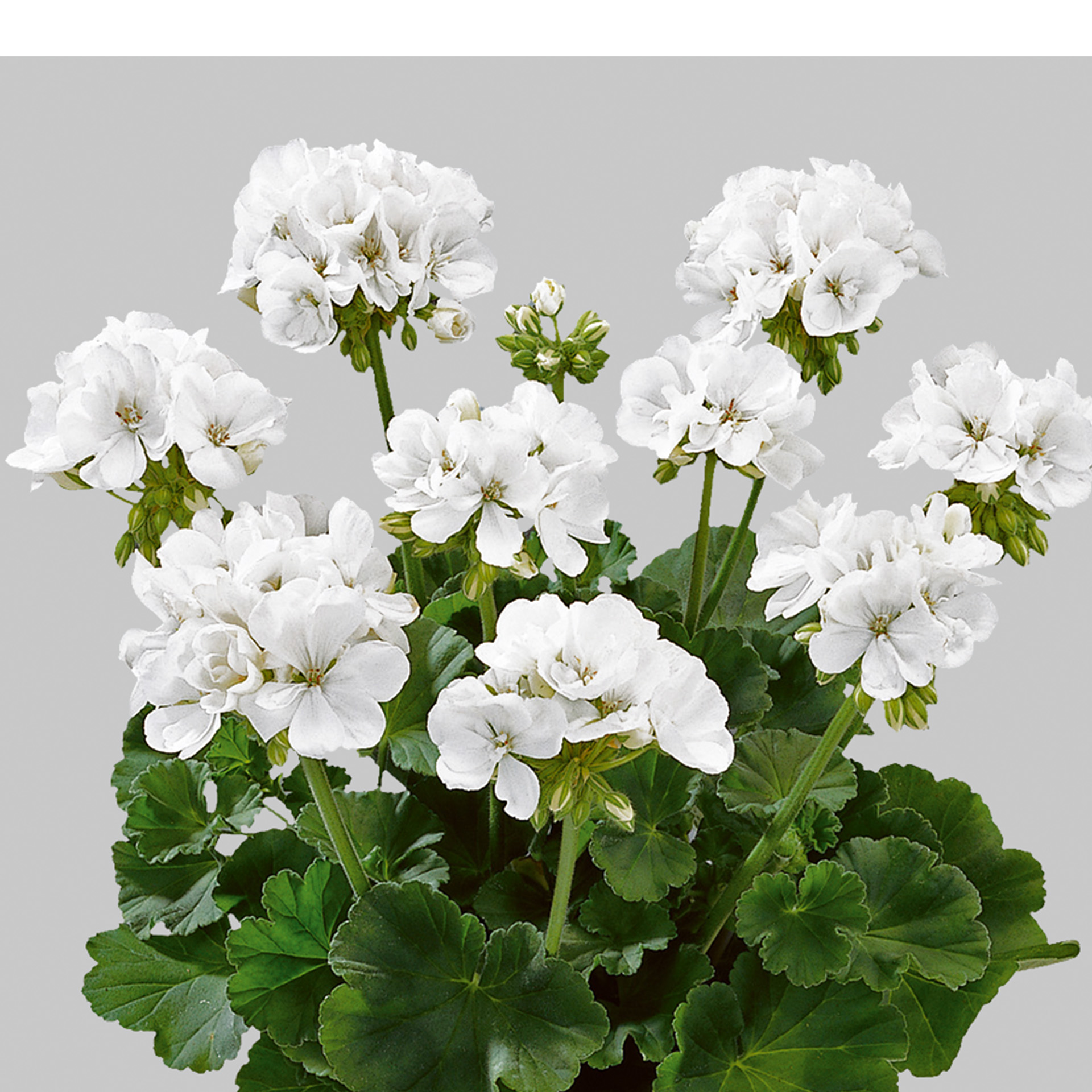 Die Geranie gehört zu den beliebtesten Balkonpflanzen, weil sie ein sehr robuster Dauerblüher ist. In unserer Gärtnerei kultivieren wir über 30 verschiedene Sorten von stehenden und hängenden Geranien. Die Sorte 'Glacis' wächst kompakt mit hellgrünem Laub und hat halbgefüllte reinweiße Blüten. Von Mai bis Oktober wachsen immer neue Blüten nach.