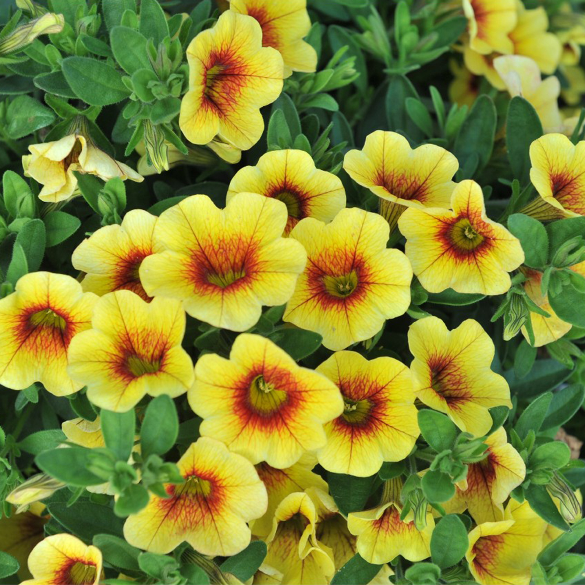 Die Calibrachoa, auch Zauberglöckchen oder Rubinglöckchen genannt, ist eng verwandt mit der Petunie. Die Blüten sind kleiner, aber sehr zahlreich. Durch Neuzüchtungen gab es bei dieser Pflanze in den letzten Jahren immer wieder herrliche Farben und Farbkombinationen. Diese Sorte hat tolle gelbe Blüten mit orangefarbener Mitte.