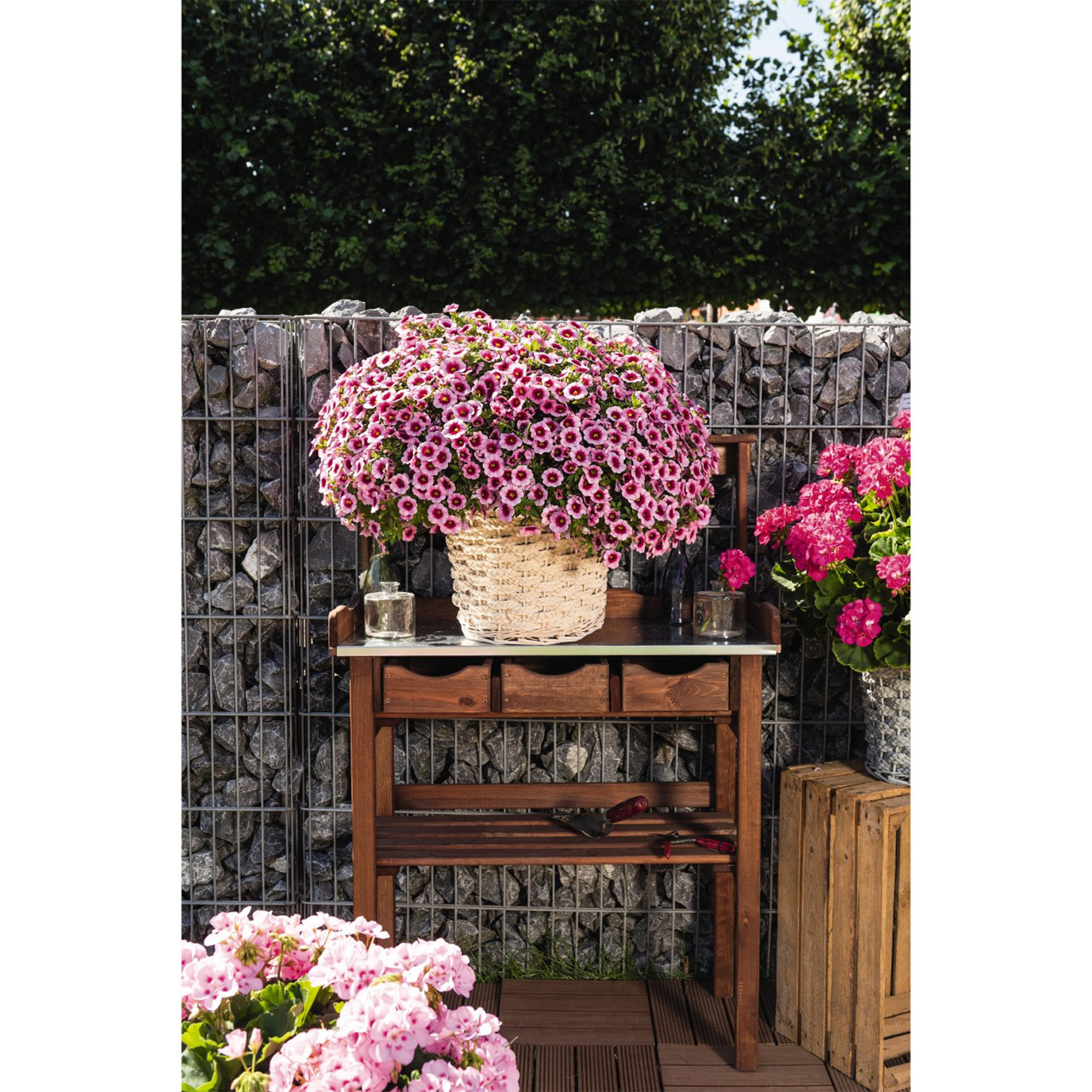 Die Calibrachoa, auch Zauberglöckchen oder Rubinglöckchen genannt, ist eng verwandt mit der Petunie. Die Blüten sind kleiner, aber sehr zahlreich. Durch Neuzüchtungen gab es bei dieser Pflanze in den letzten Jahren immer wieder herrliche Farben und Farbkombinationen. Diese Sorte hat spektakuläre rosa Blüten mit pinkfarbener Mitte.