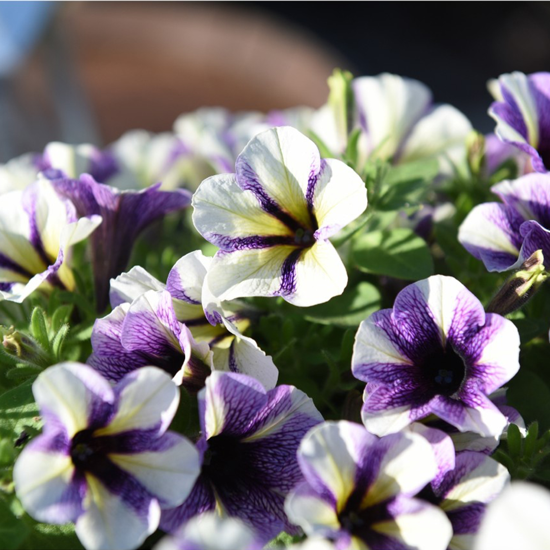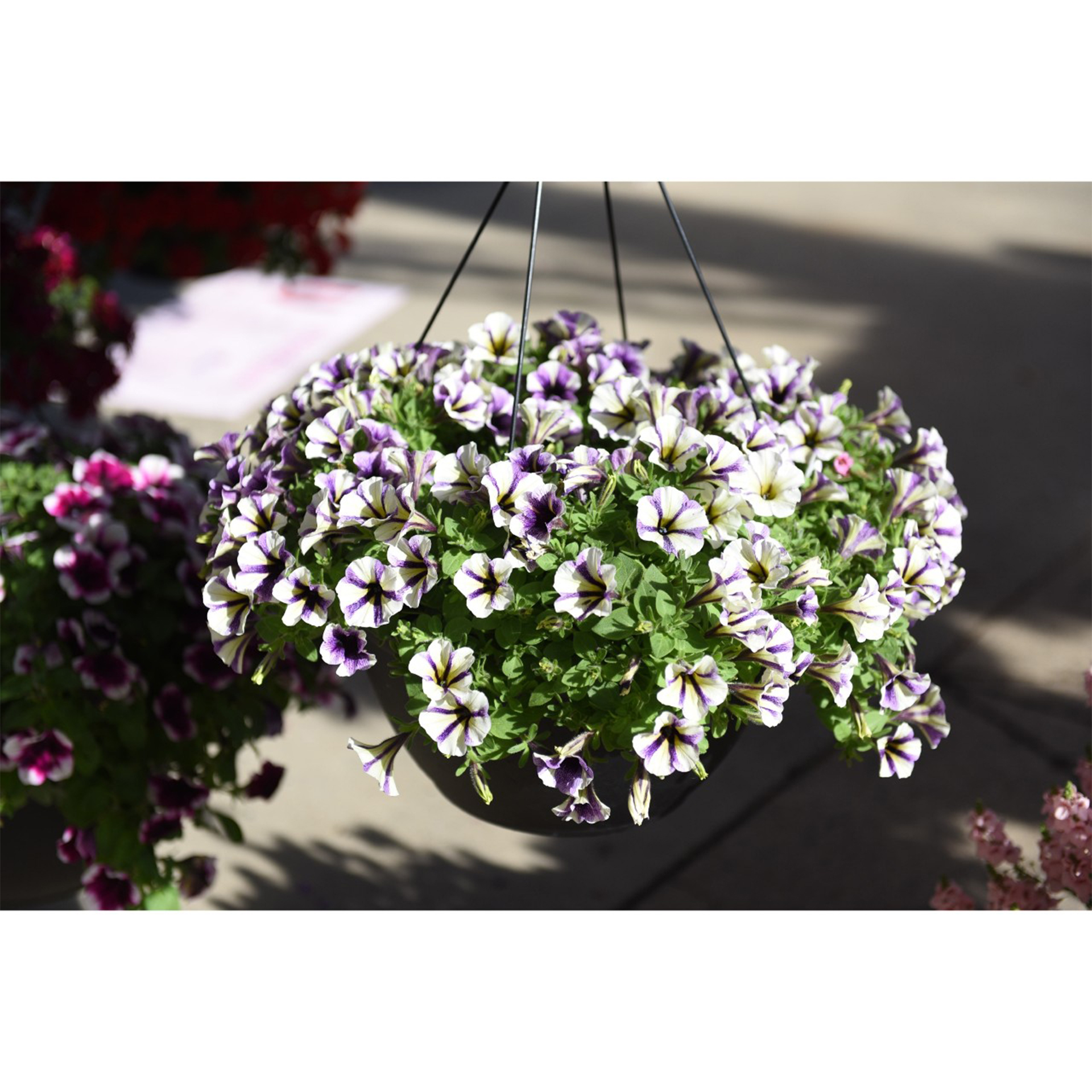 Surfinien sind hängende Petunien mit üppigem Wuchs. Sie sind sehr beliebte Balkonblumen, und ihre Ranken können je nach Sorte bis zu 60cm lang herunter hängen. Die großen trichterförmigen Blüten erscheinen von Mai bis Oktober. Diese Sorte hat wunderschöne lila/weiß gestreifte Blüten.