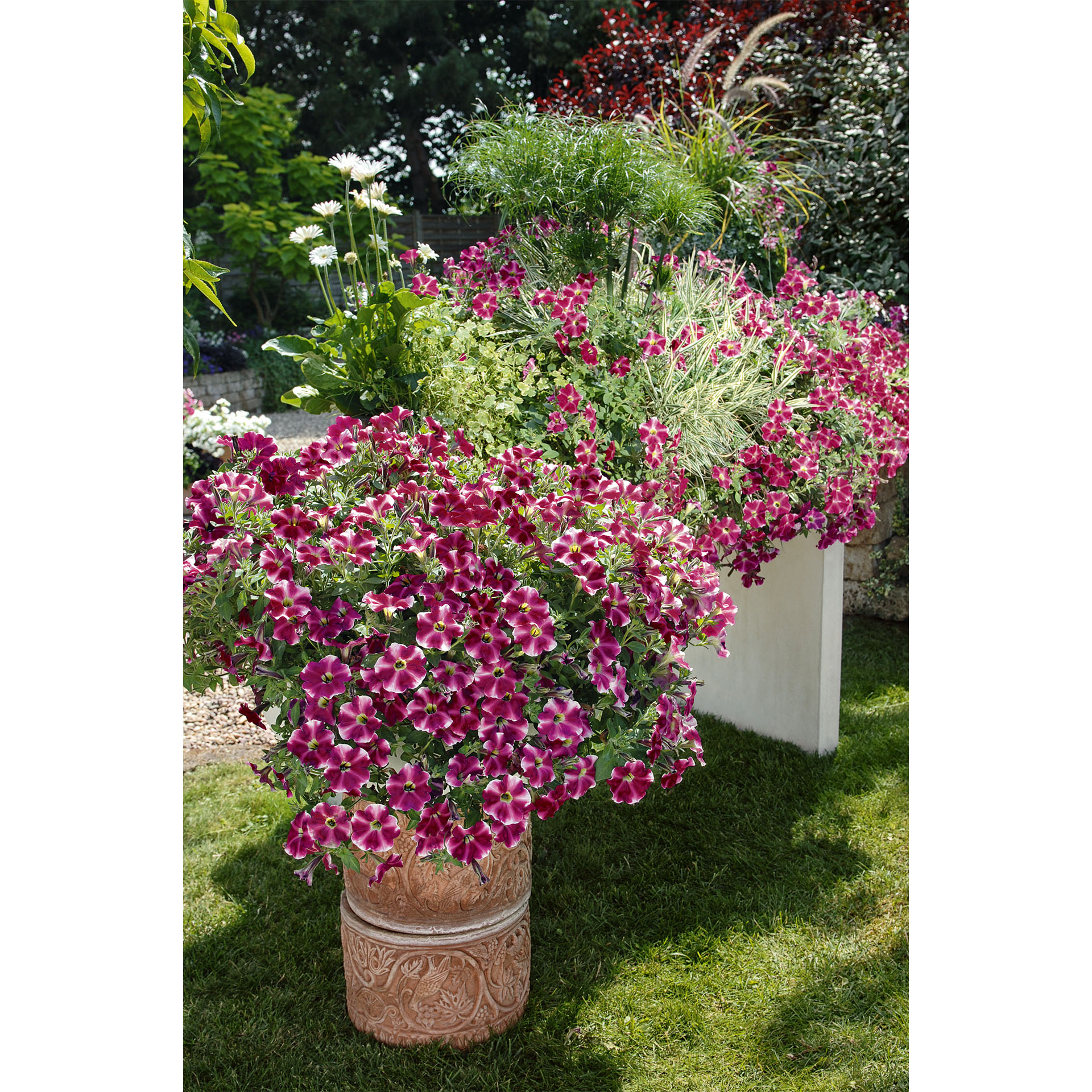 Die Triebe können bis zu 60cm lang werden, trotzdem wächst die Pflanze dicht und kompakt. Geeignet sind Petunien für Blumenampel oder Balkonkasten, große Kübel oder das Beet. Sie können gut mit anderen starkwachsenden Blühpflanzen wie hängenden Geranien, Verbenen oder Goldmarie kombiniert werden.