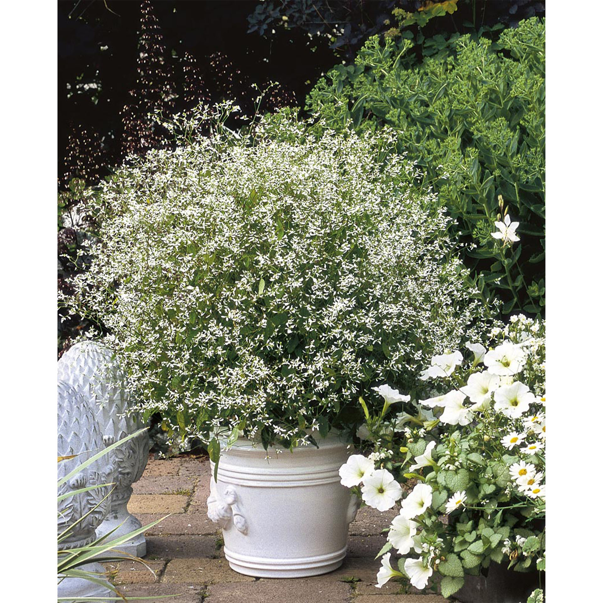 Der Zauberschnee ist unter den Balkonpflanzen relativ jung, es gibt sie erst seit den 2000er-Jahren zu kaufen. Auf den ersten Blick erinnert er ein bisschen an Schleierkraut, denn er hat ebenso verzweigte Triebe mit kleinen weißen Blüten, die ihn sehr filigran wirken lassen. Er gehört zur Familie der Wolfsmilchgewächse, beachten Sie also bitte, dass er leicht giftig ist. Der Zauberschnee kann eine Wuchshöhe und Breite von bis zu 50cm erreichen.