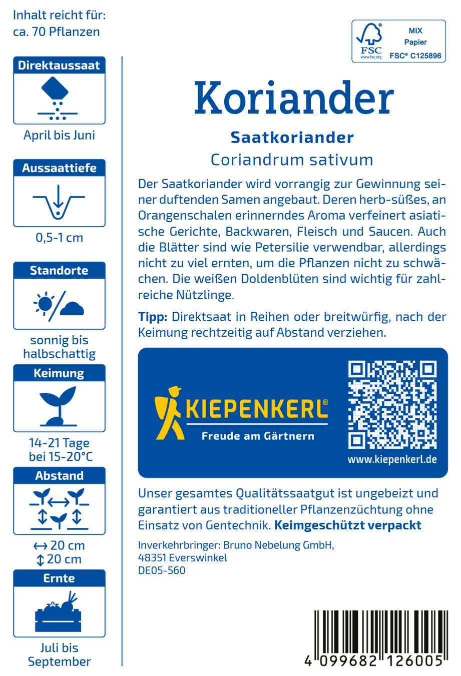 Verwendung: Der Samen gibt Fleischgerichten, Eintöpfen und als Einmachgewürz zu Gurken und Rote Bete eine pfefferartige Würze. Zerkleinerte Samen eignen sich als Lebkuchengewürz oder zum Brotbacken als besonders verdauungsfördernd. Die frischen Blätter nur in kleinen Mengen für Fleischbrühe verwenden. Sie geben einen intensiven, fast unangenehmen Geruch ab. Haltbarmachung: Samen trocknen. Günstige Nachbarschaft: Anis.