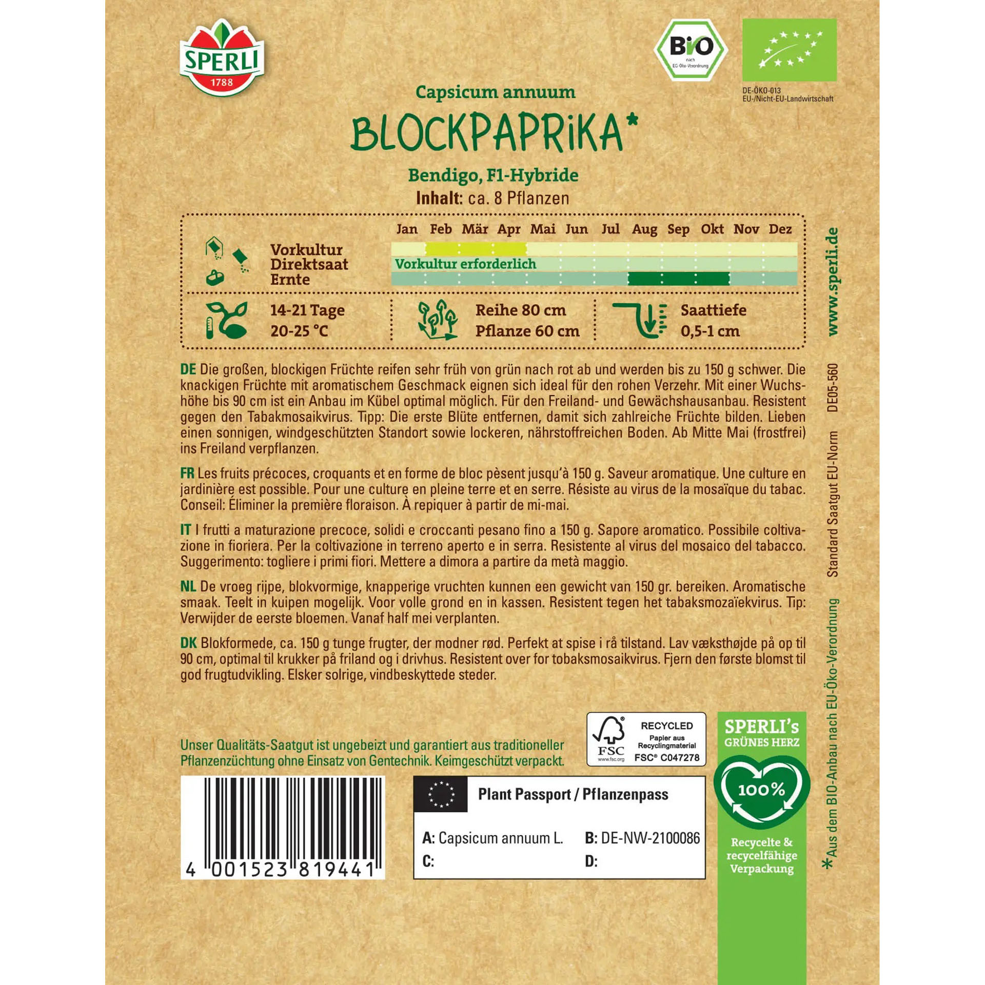 Die BIO Blockpaprika 'Bendigo' ist eine frühreifende Sorte mit großen, knackigen Früchten. Sie hat einen sehr aromatischen Geschmack und ist ideal für den Rohverzehr geeignet. Ihre Farbe wechselt von grün zu leuchtend rot bei Erntereife.