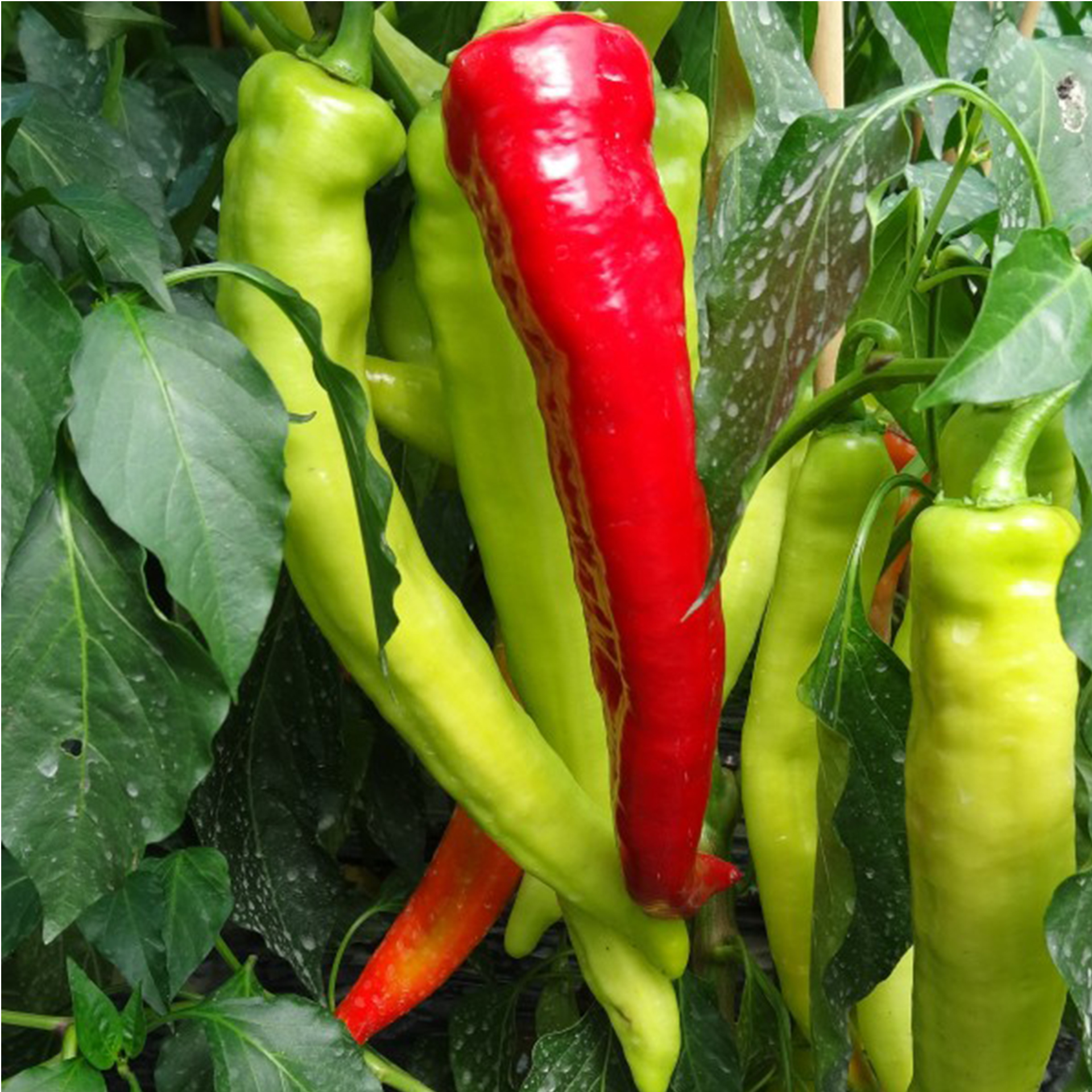 Bullhorn-Chilis sind milde Peperoni mit sehr großen fleischigen Früchten, die aufgrund ihrer Größe an Hörner eines Bullen erinnern. Sie sind ideal für würzige Salate und zum Grillen, lassen sich aber auch hervorragend einlegen. Eine sehr frühe Ernte der hellgrünen Früchte ist ab Anfang Juli schon möglich. Später verfärben sie ins Rote. Mit einer Schärfe von 2.500 – 3.000 Scoville (Schärfegrad 2), gilt diese Sorte eher als süße Paprika, die sich sehr gut zum Füllen eignet. Wuchshöhe bis 120cm.