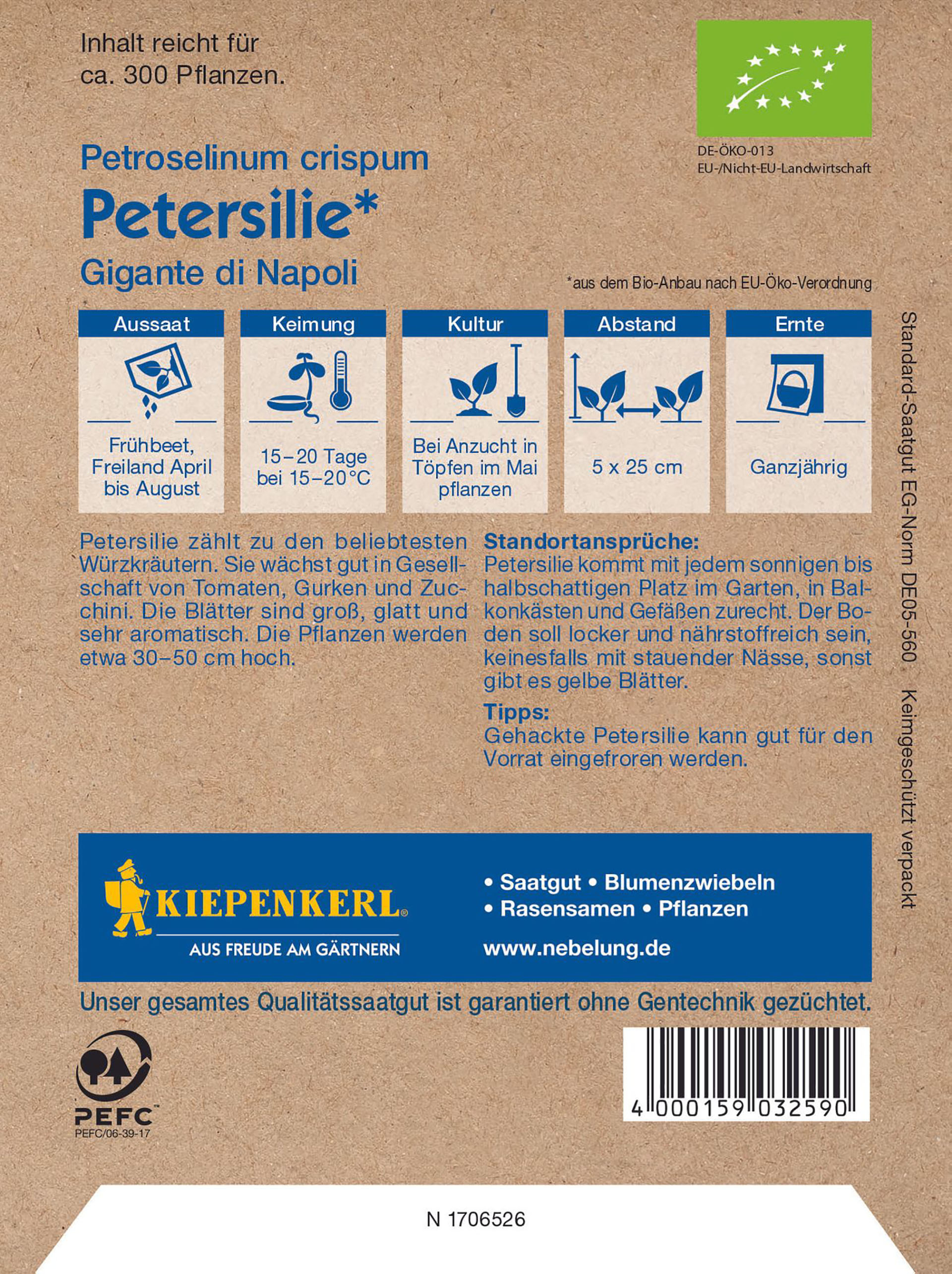 Petersilie zählt zu den beliebtesten Würzkräutern. Die Blätter sind groß, glatt und sehr aromatisch.