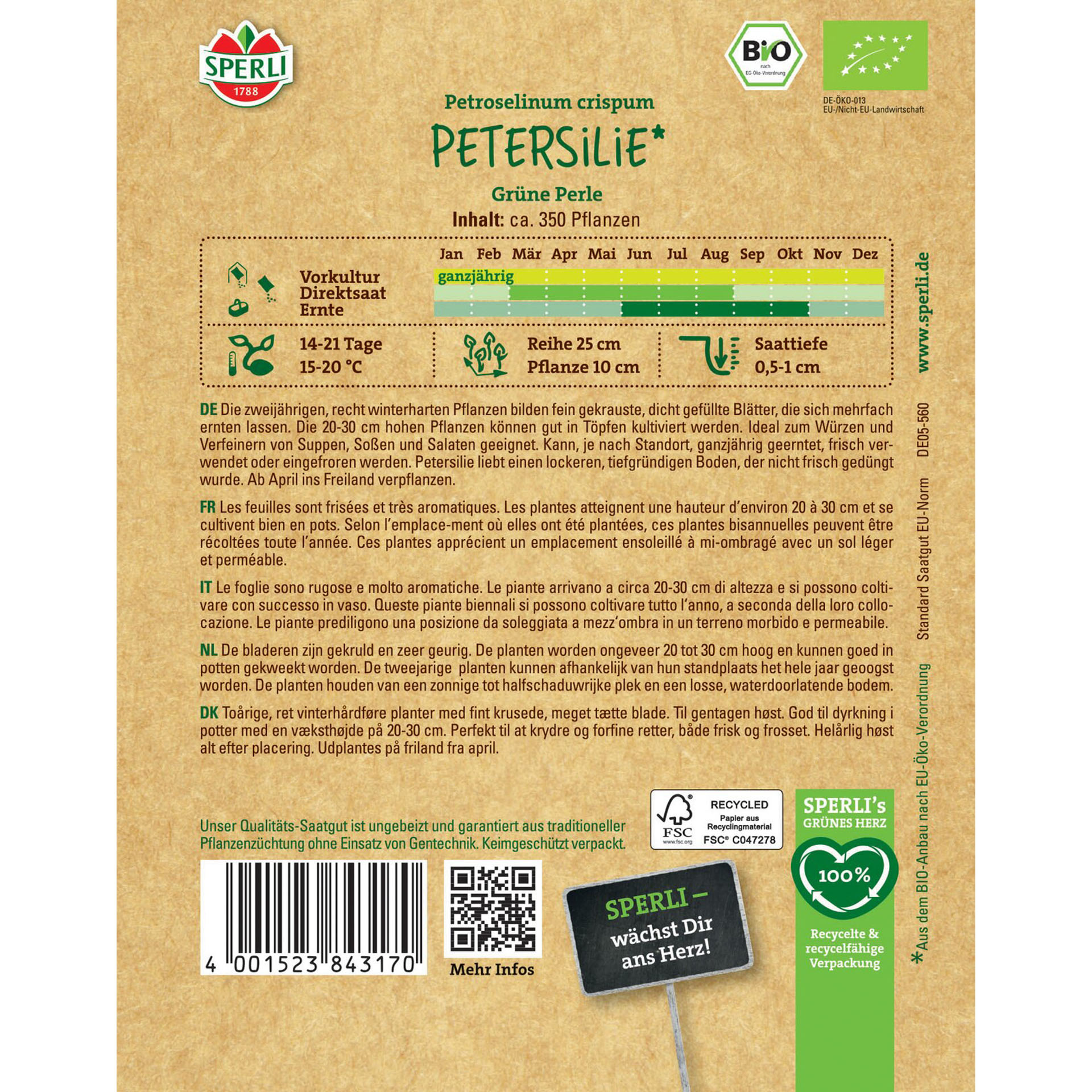 Die BIO Petersilie 'Grüne Perle' ist eine zweijährige Sorte und recht winterhart. Die fein gekrausten, typisch würzigen Blätter können mehrfach geerntet werden. Würzen und verfeinern Sie Suppen, Soßen und Salate mit der frischen Petersilie. Auch zum Einfrieren geeignet.