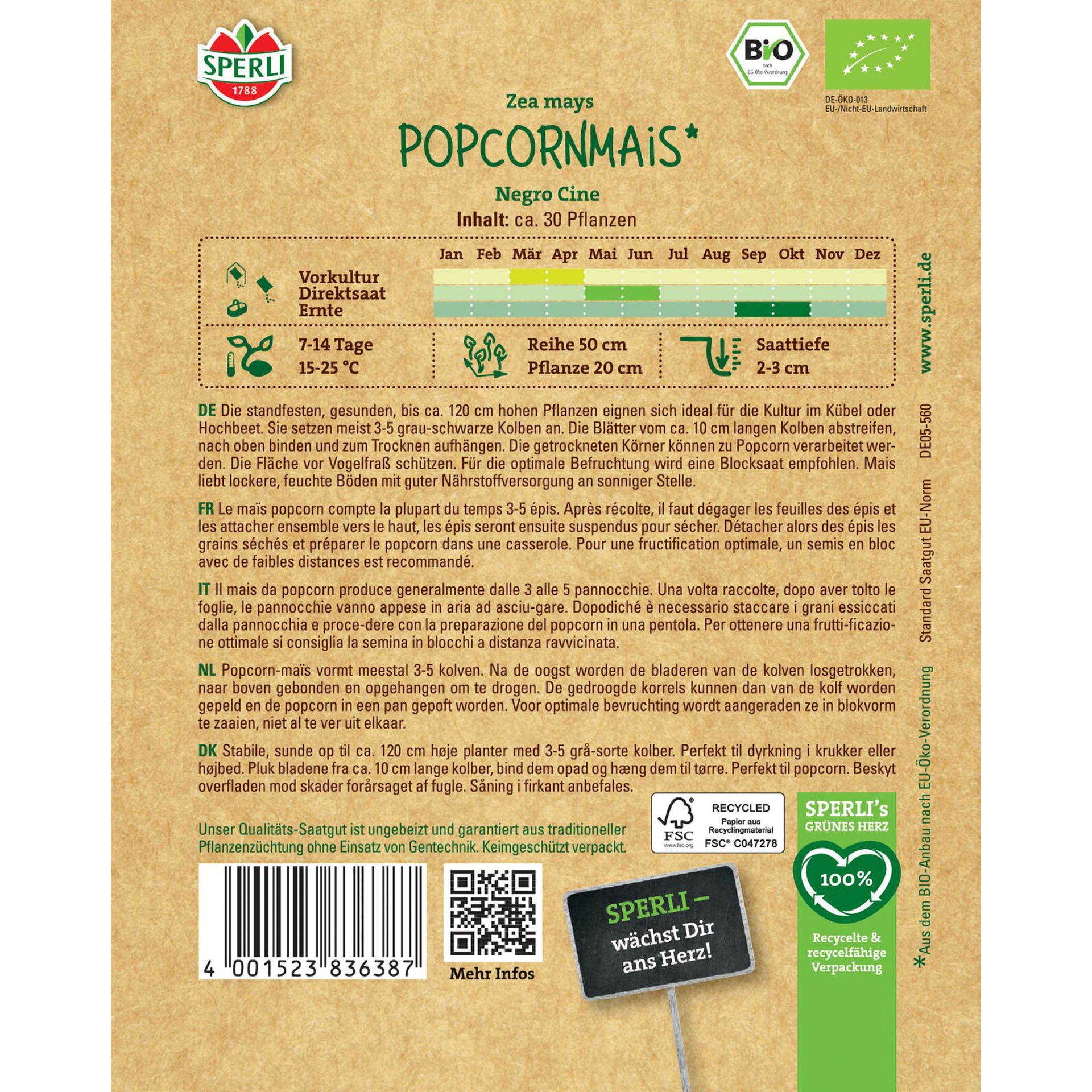 Der BIO Popcornmais 'Negro Cine' ist eine Sorte mit standfesten, gesunden Pflanzen, die 90-120cm hoch werden. Pro Pflanze erscheinen meist 3-5 Kolben. Das Besondere ist ihre grau-schwarze Farbe. Der Geschmack ist nussig-aromatisch. Getrocknet können Sie die Körner von den Kolben entfernen und zu Popcorn verarbeiten.