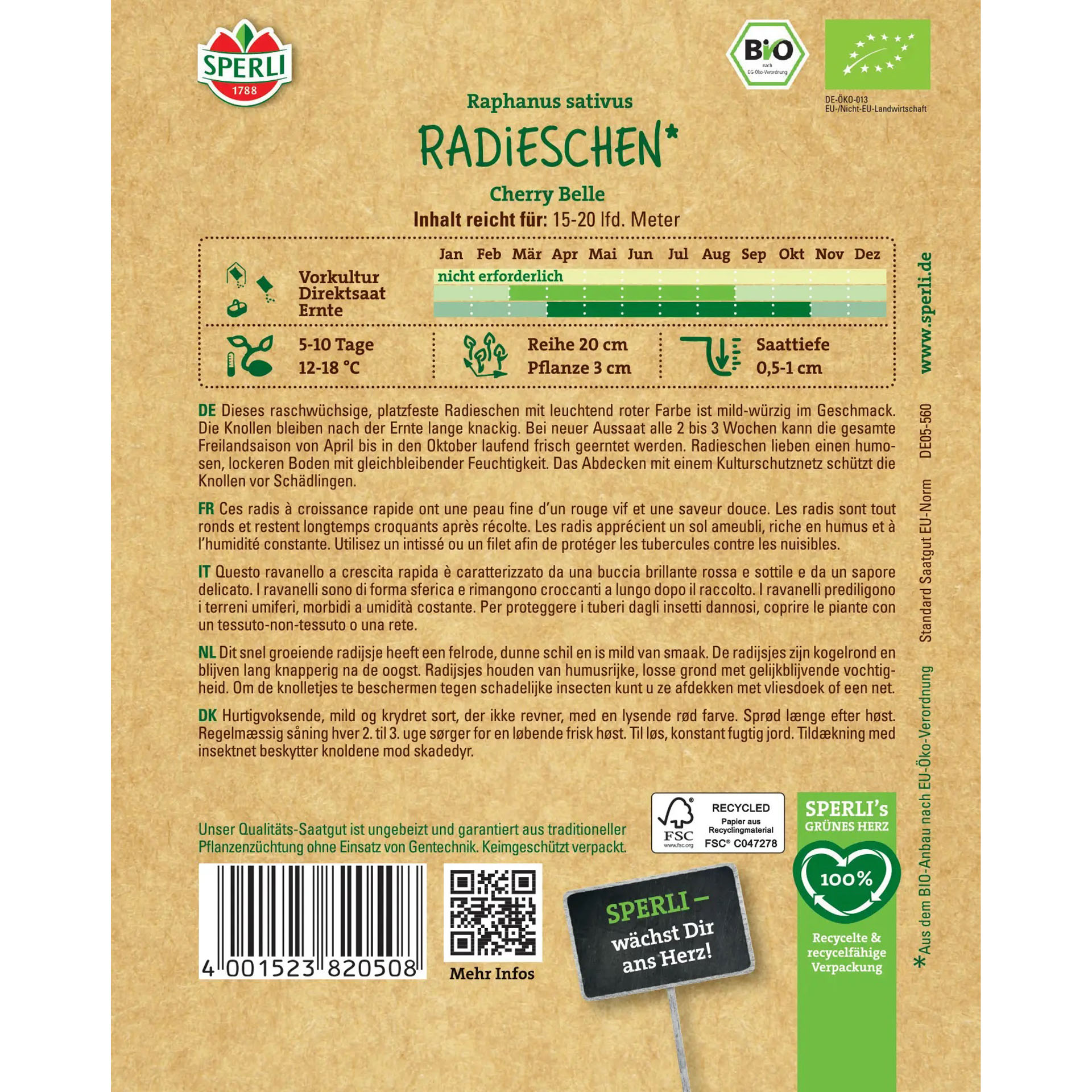 Die BIO Radieschen 'Cherry Belle' sind eine schnellwachsende Sorte. Die kugelrunden, knackigen Knollen haben eine leuchtend rote Farbe und einen angenehmen, mild-würzigen Geschmack. Bei einer Aussaat alle 2-3 Wochen können Sie bis Oktober frisch ernten.
