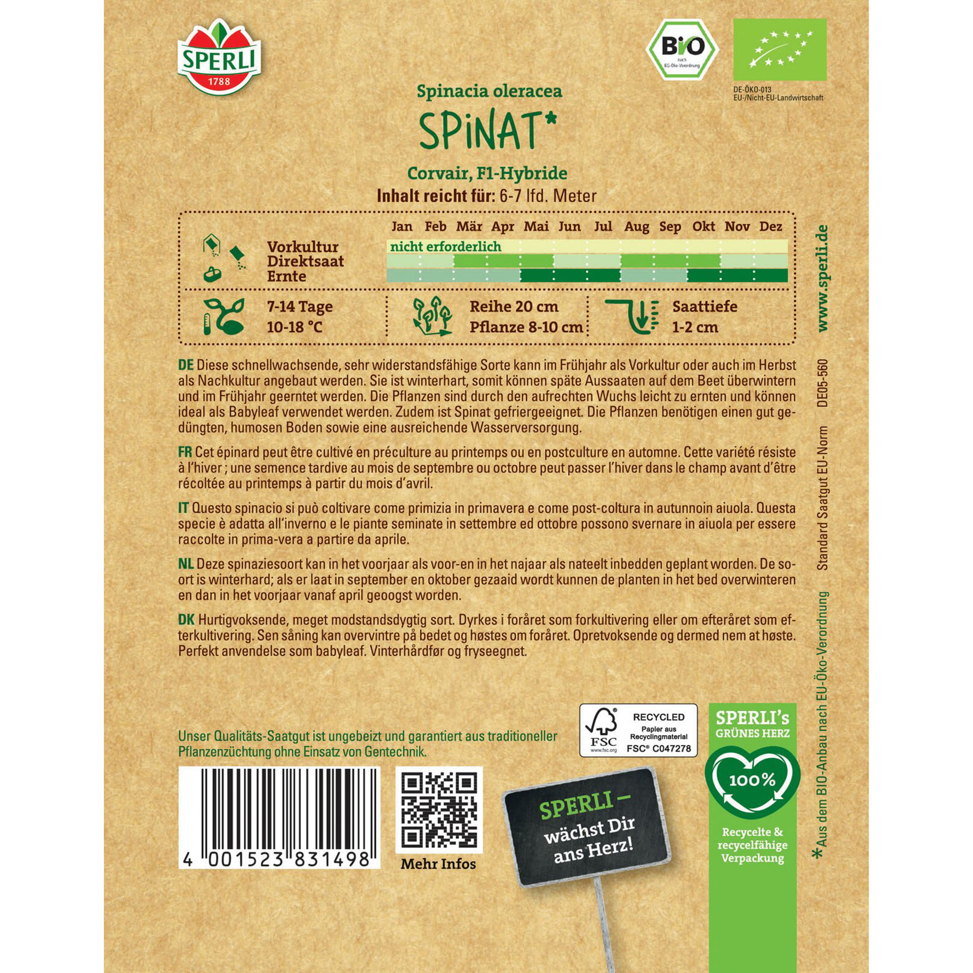 Der BIO Spinat 'Corvair' ist eine schnellwachsende, sehr widerstandsfähige Sorte. Sie kann im Frühjahr als Vorkultur oder auch im Herbst als Nachkultur angebaut werden. Bei einer späten Aussaat kann er im Beet überwintern und im Frühjahr geerntet werden. Zudem ist er gefriergeeignet.
