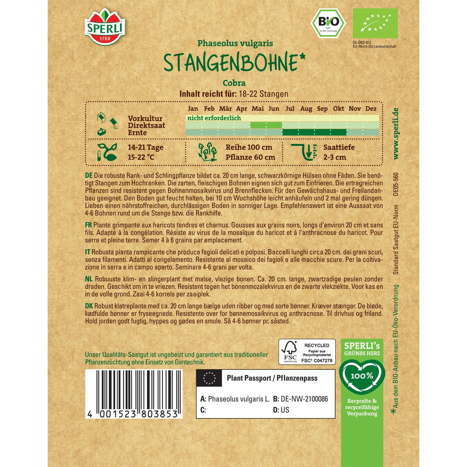 Die BIO Stangenbohne 'Cobra' ist eine robuste Rank- und Schlingpflanze. Sie hat schwarzkörnige Hülsen ohne Fäden, die zahlreich erscheinen. Die zarten, schmackhaften Bohnen eignen sich gut zum Einfrieren.