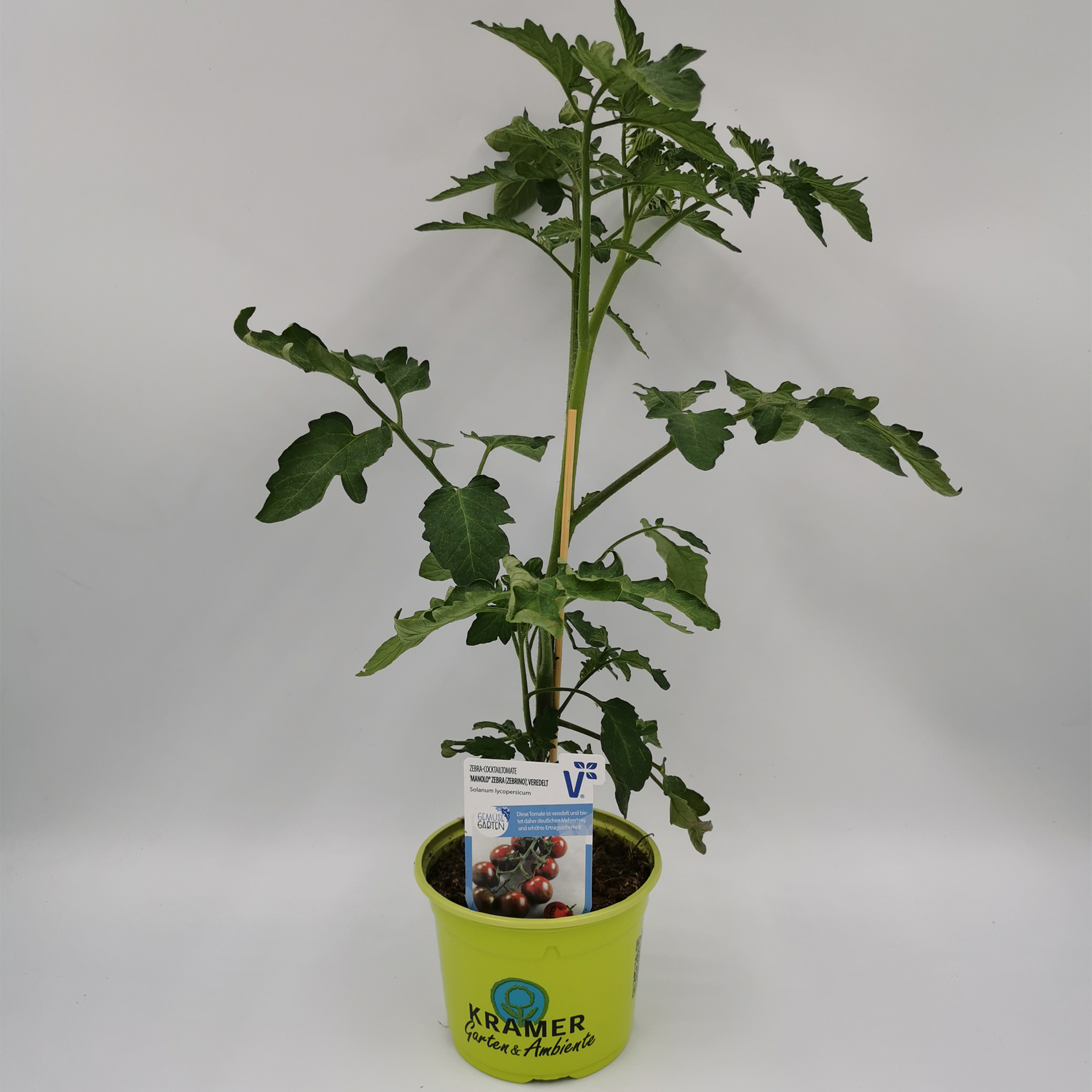 Die Zebratomate ist durch eine Veredelung besonders wüchsig und ertragreich. Die grün-roten Tomaten wachsen an langen Rispen in perlenartiger aufeinandergereihter Form heran. In ihrem einjährigen Lebenszyklus erreicht die schöne Zebra Cocktailtomate 'Zebrino' eine Wuchshöhe von 150-200cm.