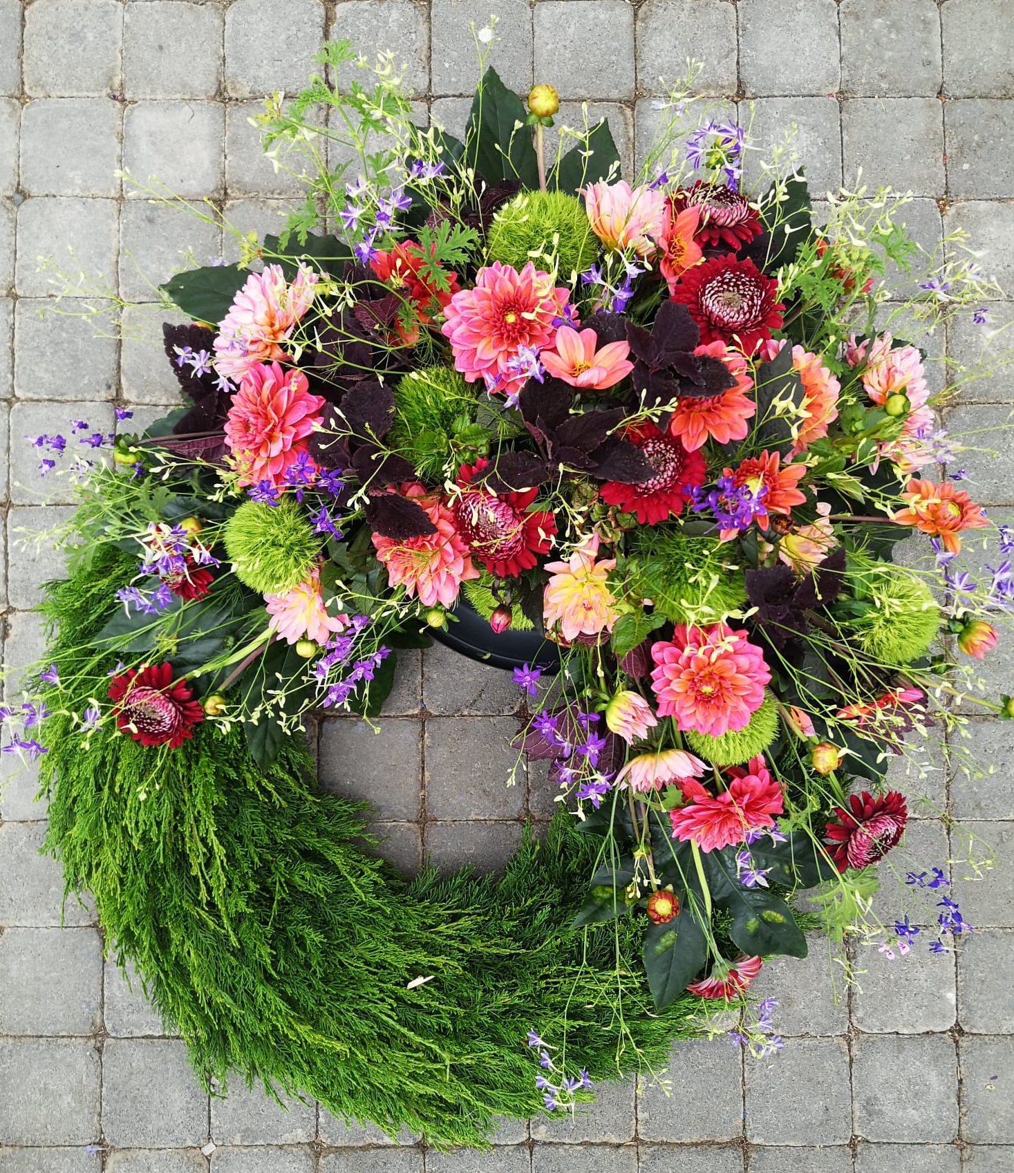 Ganz klassisch gearbeitet mit Blumengesteck auf gewickeltem Koniferen Kranz