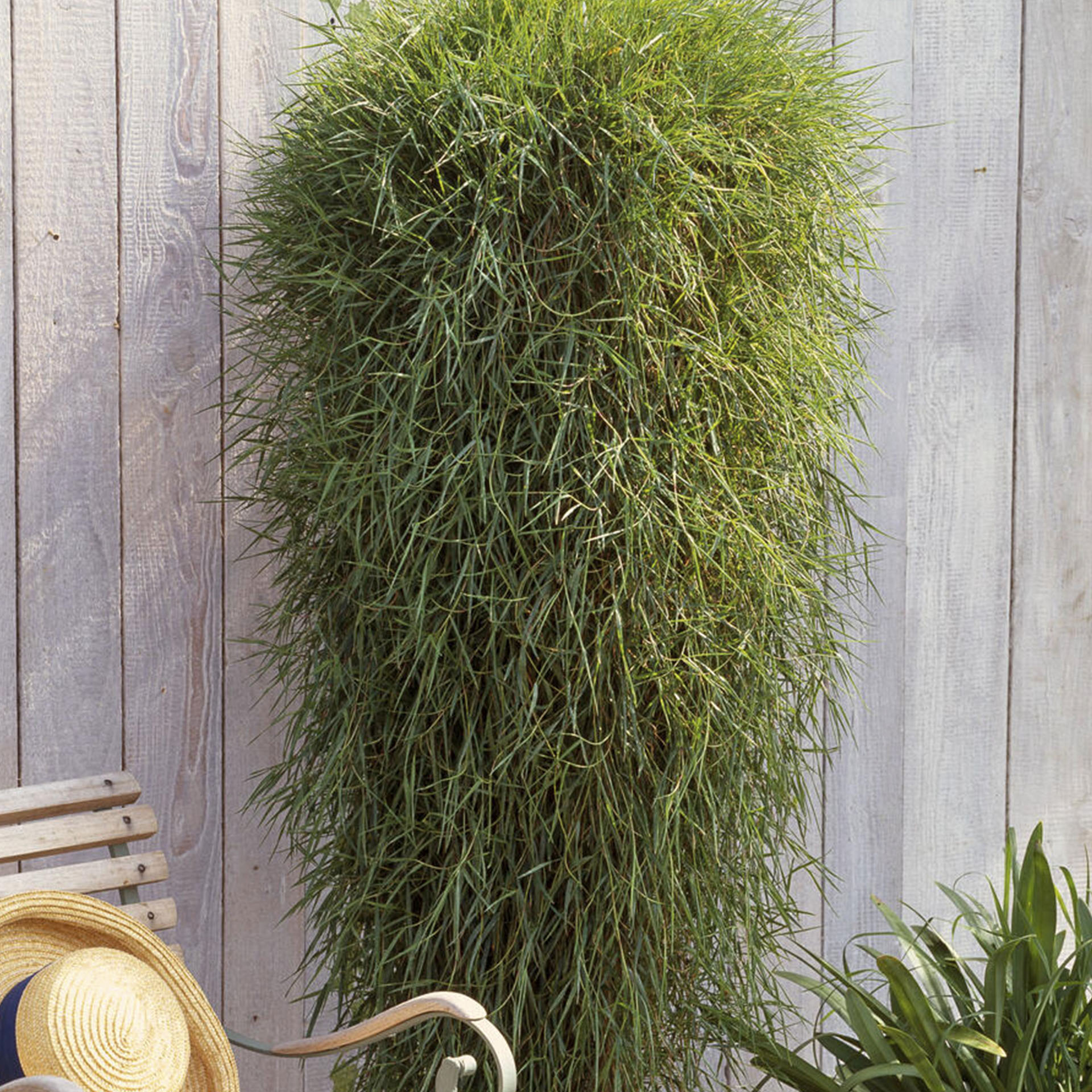 Der Hänge-Bambus, auch Straußgras genannt, ist ein dekoratives Grün für Garten, Terrasse und Balkon. Er ist ein stark wachsendes, hängendes Deko-Gras und eignet sich für Hängeampeln, Kästen und auch als Bodendecker oder für Rasenflächen. Die Kombination mit Sommerblumen ergibt einen tollen Hingucker. Wuchshöhe bis 150cm.