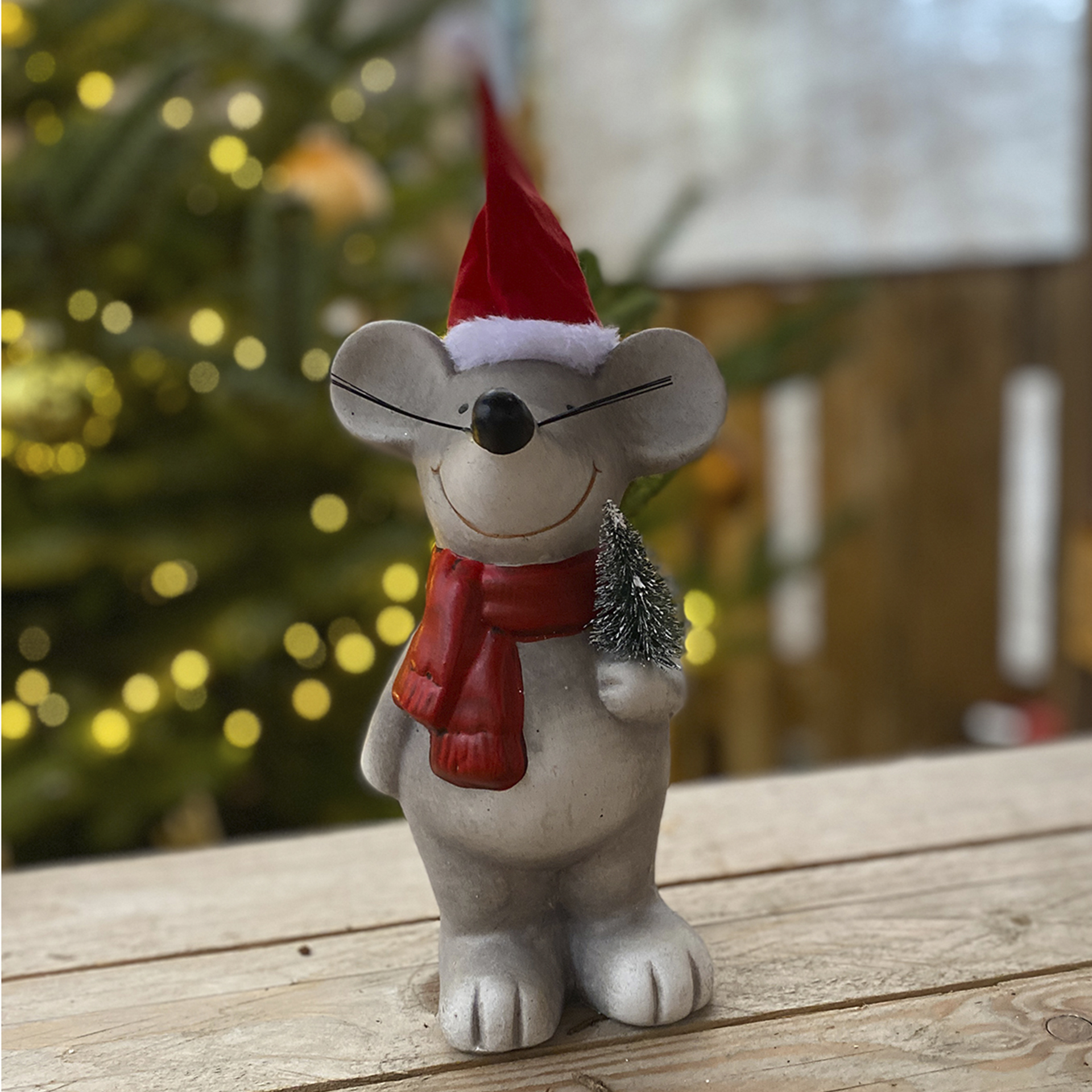 Kleine süße Maus aus Keramik mit Mütze und Weihnachtsbaum. Weihnachtliche Dekoration für ein stimmungsvolles Ambiente.