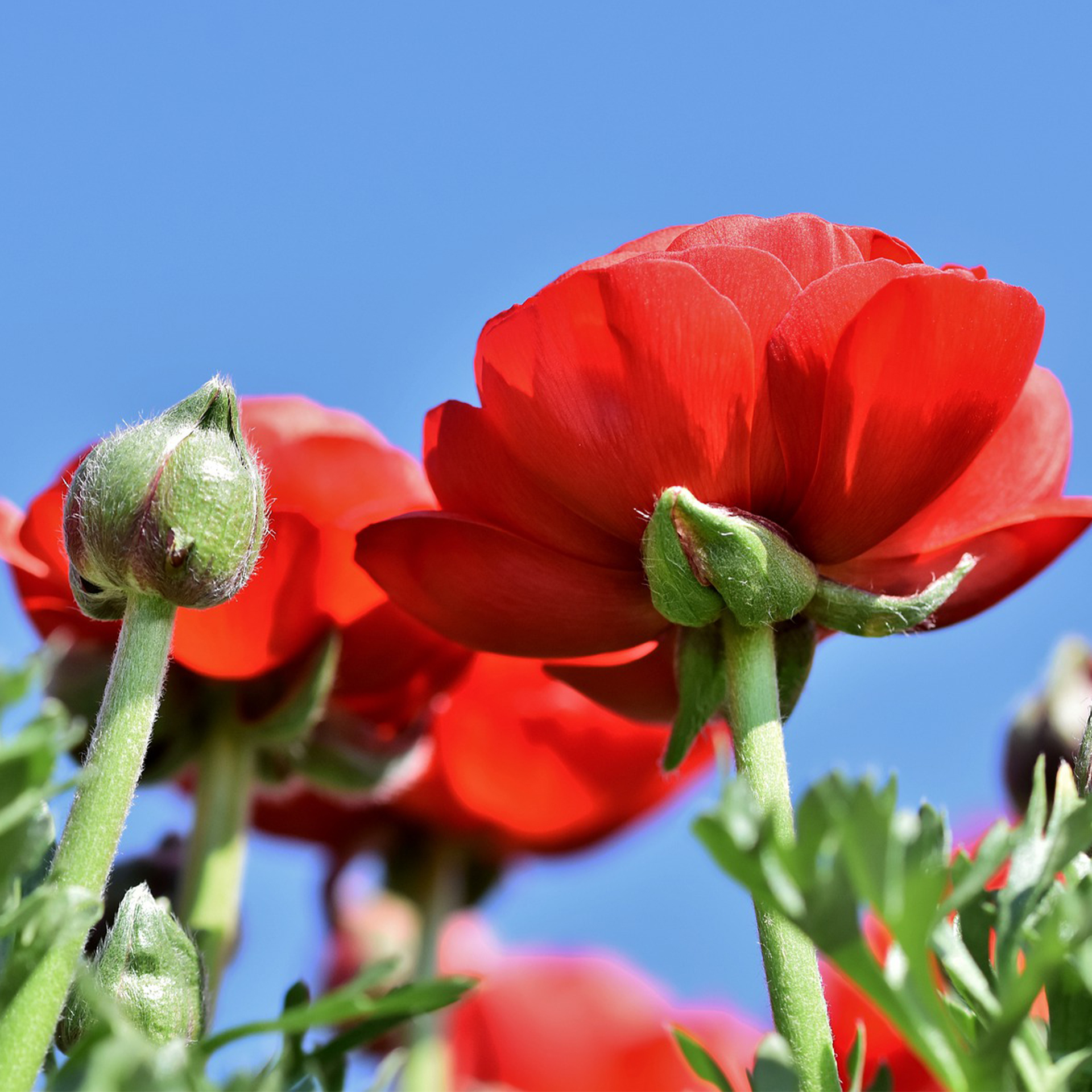 Die Ranunkel fällt vor allem durch ihre großen, reich gefüllten Blüten auf, die in leuchtenden Farben den Frühling einläuten.