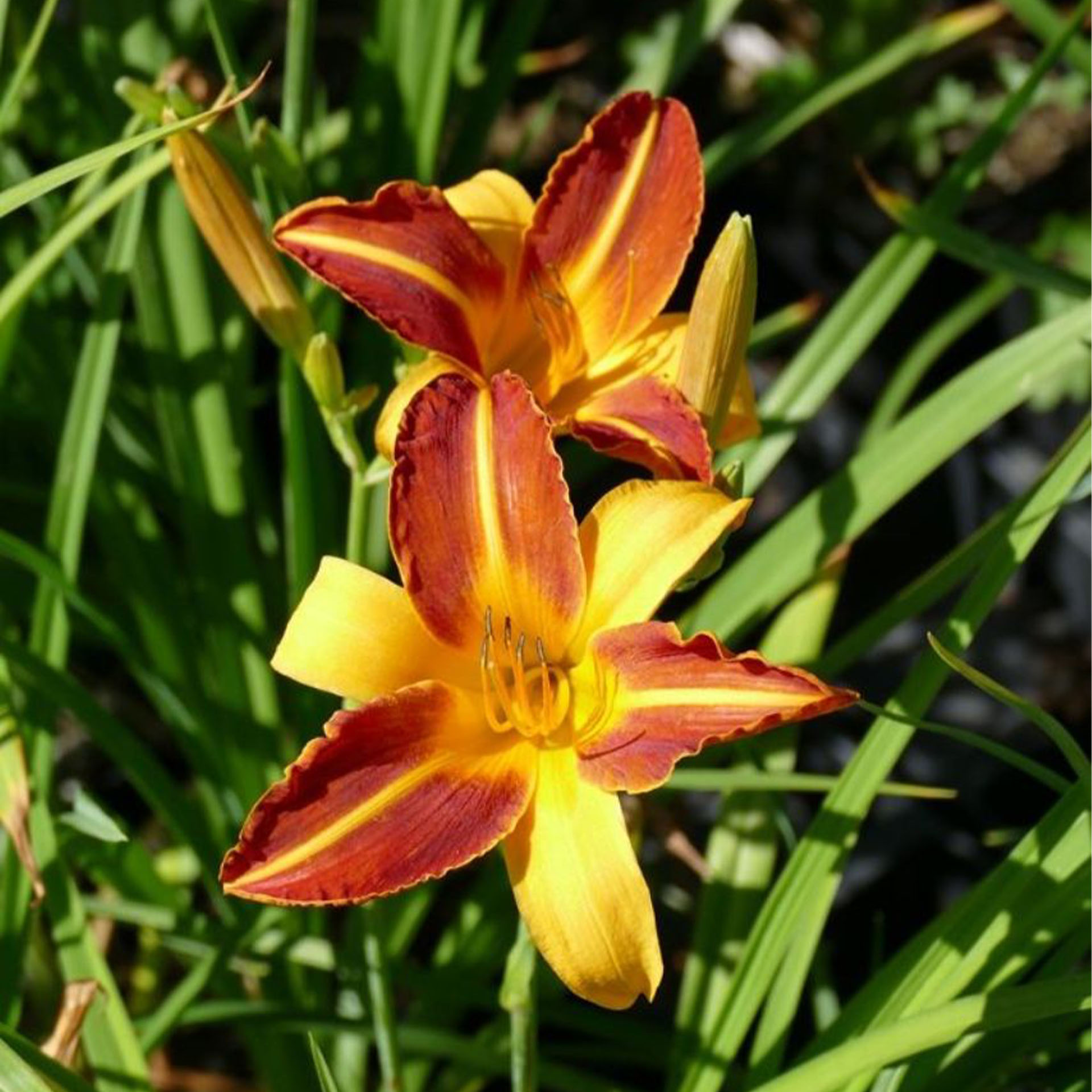 Die Taglilie 'Frans Hals' ist eine robuste Staude, die wegen ihrer leuchtend zweifarbigen Blüten ein Highlight in jedem Garten ist. Die äußeren Blütenblätter sind orange-rot, während die inneren Blütenblätter goldgelb sind. Jede Blüte hält nur einen Tag, aber die Pflanze produziert während der Blütezeit kontinuierlich neue Blüten. Gute Nahrungsquelle für Insekten.