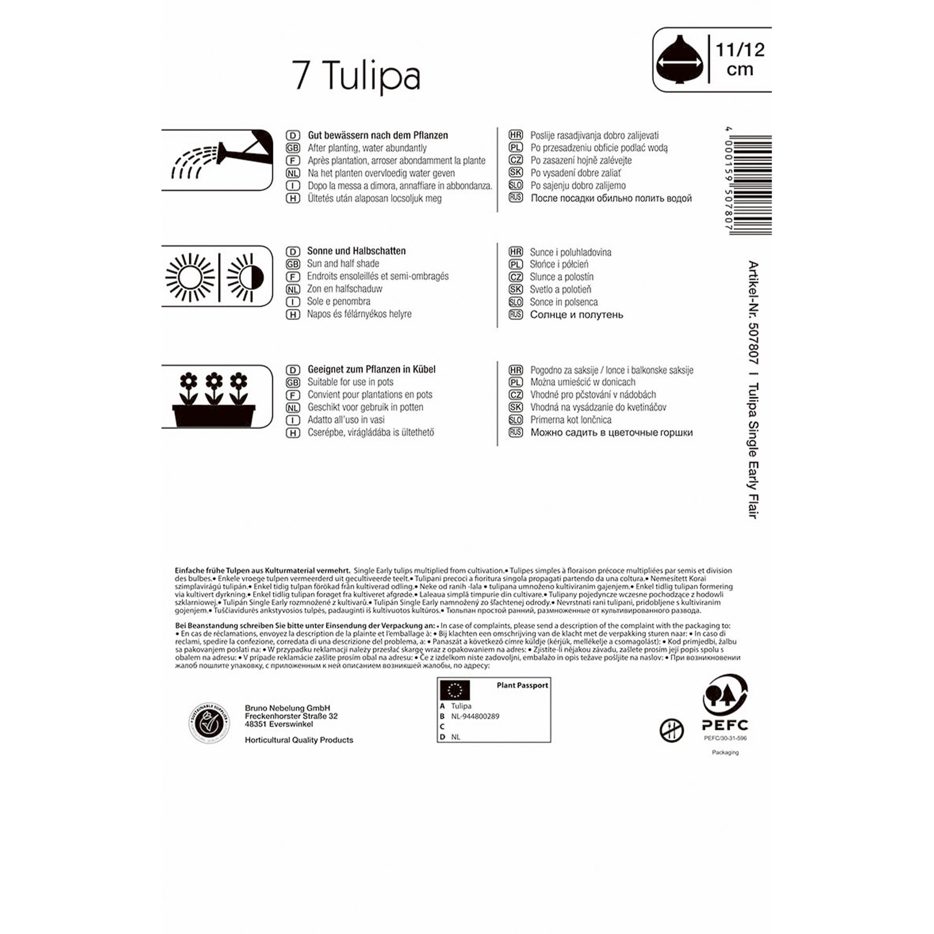 Die Tulpe 'Flair' ist eine attraktive und robuste Tulpe, die besonders wegen ihrer intensiven Farben geschätzt wird. Die Blüten sind leuchtend rot mit einem auffälligen, sonnengelben Rand an den Blütenblättern. Diese Farbkombination verleiht der Tulpe ein strahlendes Aussehen, das im Frühlingsgarten sofort ins Auge fällt. Aufgrund ihrer robusten Stiele ist 'Flair' eine ausgezeichnete Schnittblume, die sich gut in der Vase hält.