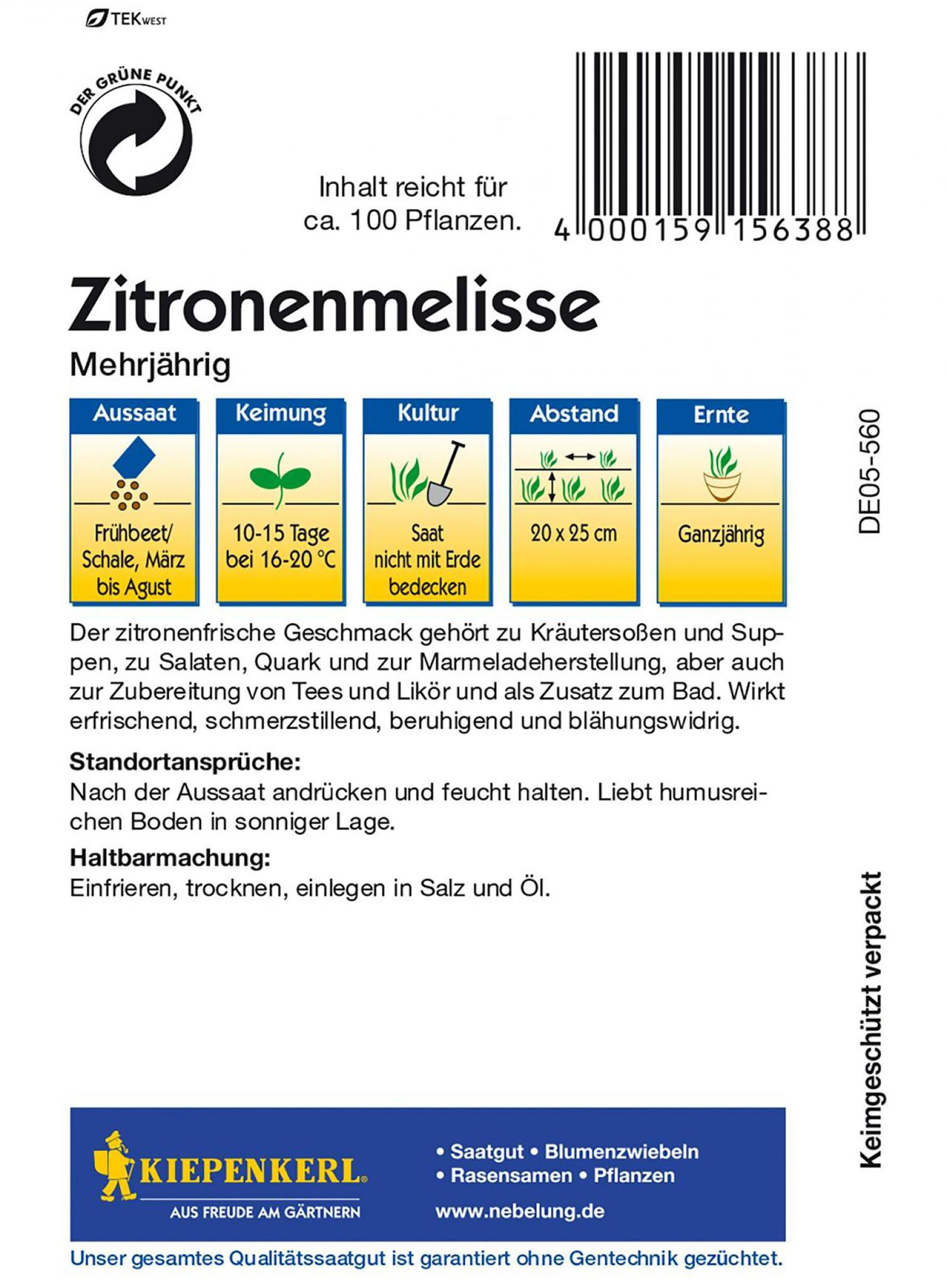 Verwendung: Der zitronenfrische Geschmack gehört zu Kräutersoßen und Suppen, zu Salaten, Quark und Marmeladeherstellung, aber auch zur Zubereitung von Tees und Likör und als Zusatz zum Bad. Wirkt erfrischend, schmerzstillend, beruhigend und blähungswidrig. Haltbarmachung: Einfrieren, trocknen, einlegen in Salz und Öl.