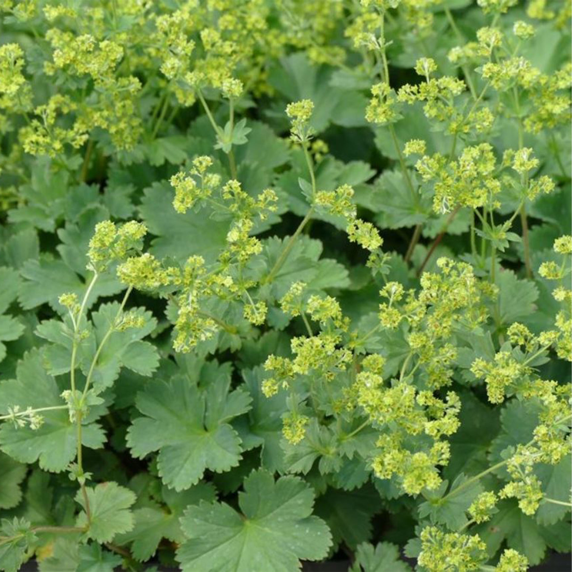 Der Zwerg-Frauenmantel ist eine attraktive, niedrig wachsende Staude. Die zarten, schalenförmigen Blüten sind klein, gelb-grün und in lockeren Dolden angeordnet. Die grau-grünen Blätter haben eine samtige Textur. Sie sind oft mit einem silbrigen Glanz bedeckt und zeigen nach Regen oder Bewässerung schöne Tau- oder Wassertropfen, die auf ihnen liegen bleiben.